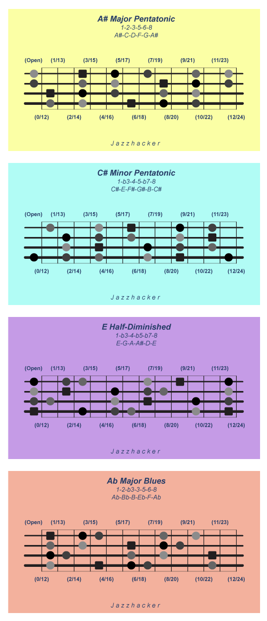 Jazzhacker Scales and Modes for 6-String Guitar, 6-String Bass, 5-String Bass, and 4-String Bass are practice, study and reference guides for all musicians.